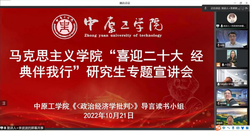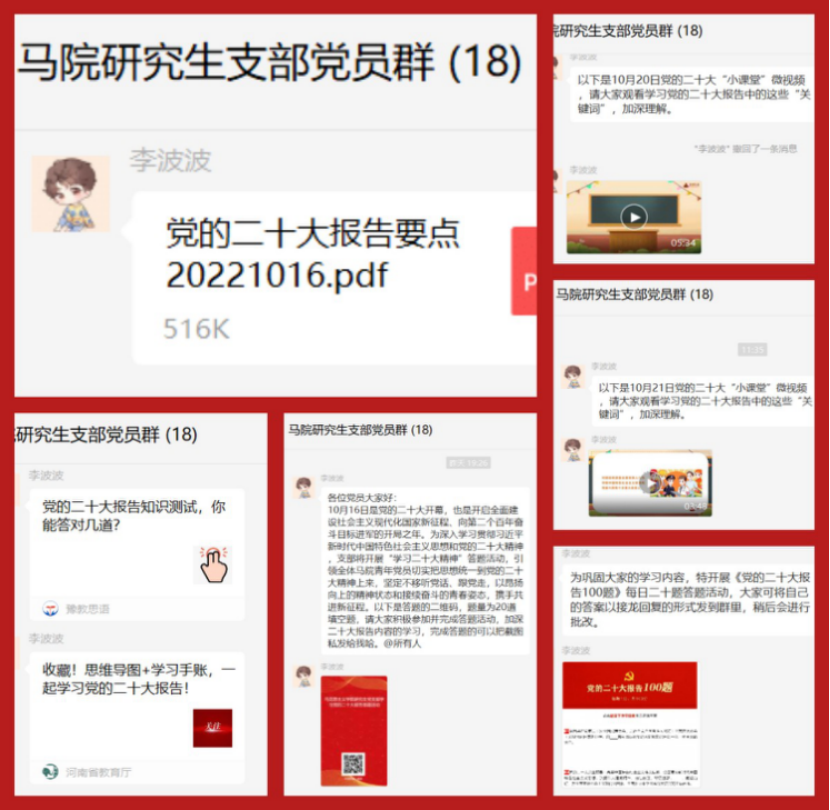 支部积极创新学习模式,丰富学习内容。一是共观开幕会直播,突出学习时效。组织党员线上集中观看二十大现场直播,感受大会现场氛围,听取二十大报告内容。二是共学理论,领会精神。围绕二十大报告内容,在支部党员群中实时推送党的二十大报告思维导图、学习手账和“小课堂”微视频,学习党的二十大热门关键词,共同探讨二十大报告的深刻内涵与意蕴,领会习近平总书记重要讲话精神,强化信仰。三是共同交流,专题宣讲。研究生《<政治经济学批判>》导言读书小组开展了一次专题宣讲会,汇报学习二十大报告心得体会,彰显了党员的理论学习自觉与学思践悟意识。四是巩固知识,丰富学习载体。组织支部党员参与“学习二十大精神”应知应会答题活动,每天二十道测验题,巩固学习内容,加深学习印象。