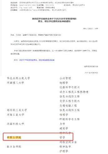 2021年10月26日,国务院学位委员会下发了《关于下达2020年审核增列的博士、硕士学位授权点名单的通知》,2020年审核增列的博士、硕士学位授权点名单,已经由国务院学位委员会审核批准。我院正式获准增列哲学一级学科硕士学位授权点,标志着学院学科建设取得了重大突破。至此,学院共有哲学、马克思主义理论2个一级学科硕士学位授权点,今后将着力推进两个学科交叉协同发展,努力打造特色学科品牌!