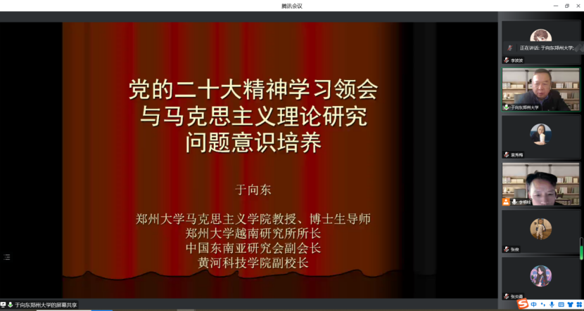 为学习贯彻党的二十大精神,加强马克思主义理论学科研究生培养,应永利官网研究生处与永利集团3044官网欢迎您邀请,12月29日下午,郑州大学永利集团3044官网欢迎您教授、博士生导师于向东老师为我院师生作主题为《党的二十大精神学习领会与马克思主义理论研究问题意识培养》的线上学术报告,永利官网人文社科相关专业的部分教师和研究生参加,报告会由李明桂副院长主持。