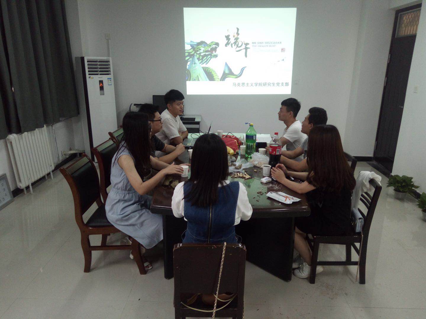 马院研究生党支部齐聚3号组团楼C503欢度端午佳节。在研究生秘书袁秀梅老师的倡议下,学院研究生一年级、研究生二年级的党员代表、学生代表参加了此次活动。在研161班团支书郭子良的带领下,大家围桌而坐,一起诵读经典,以诵读古诗词的方式表达对伟大爱国诗人屈原的惦念和哀思。与此同时,大家还一起分享自己家乡关于端午节的民俗、习惯等,地域差异引发的节日习俗的差异引得大家忍俊不禁。