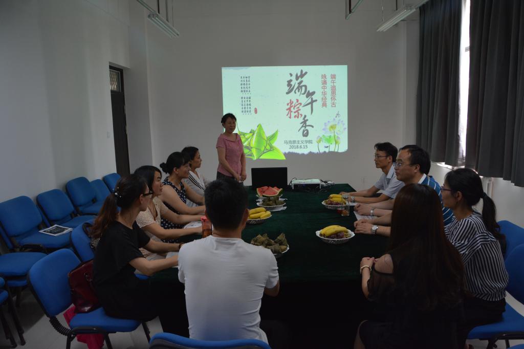 接下来教工在3号组团楼C605举办以“端午追思怀古、咏诵中华经典” 为主题的端午活动,活动由马院党总支书记虎业勤主持,五位教师代表分别咏诵中华经典,缅怀故人屈原,通过重温中华经典,学习了屈原爱国爱民、坚持真理、宁死不屈的精神和高尚的人格。