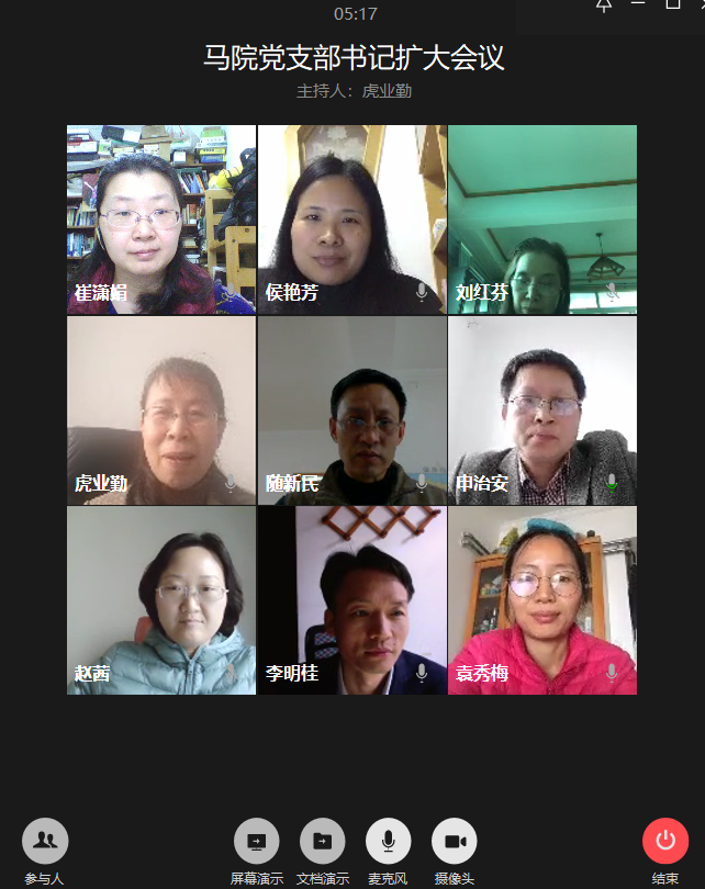 其次,虎书记总结我院2020年第一期意识形态研判会议取得的成绩,提议第二期意识形态工作研判的意向和责任支部等事项,“思修”支部书记刘红芳等就如何进一步开好意识形态研判工作提出了很好的建议。