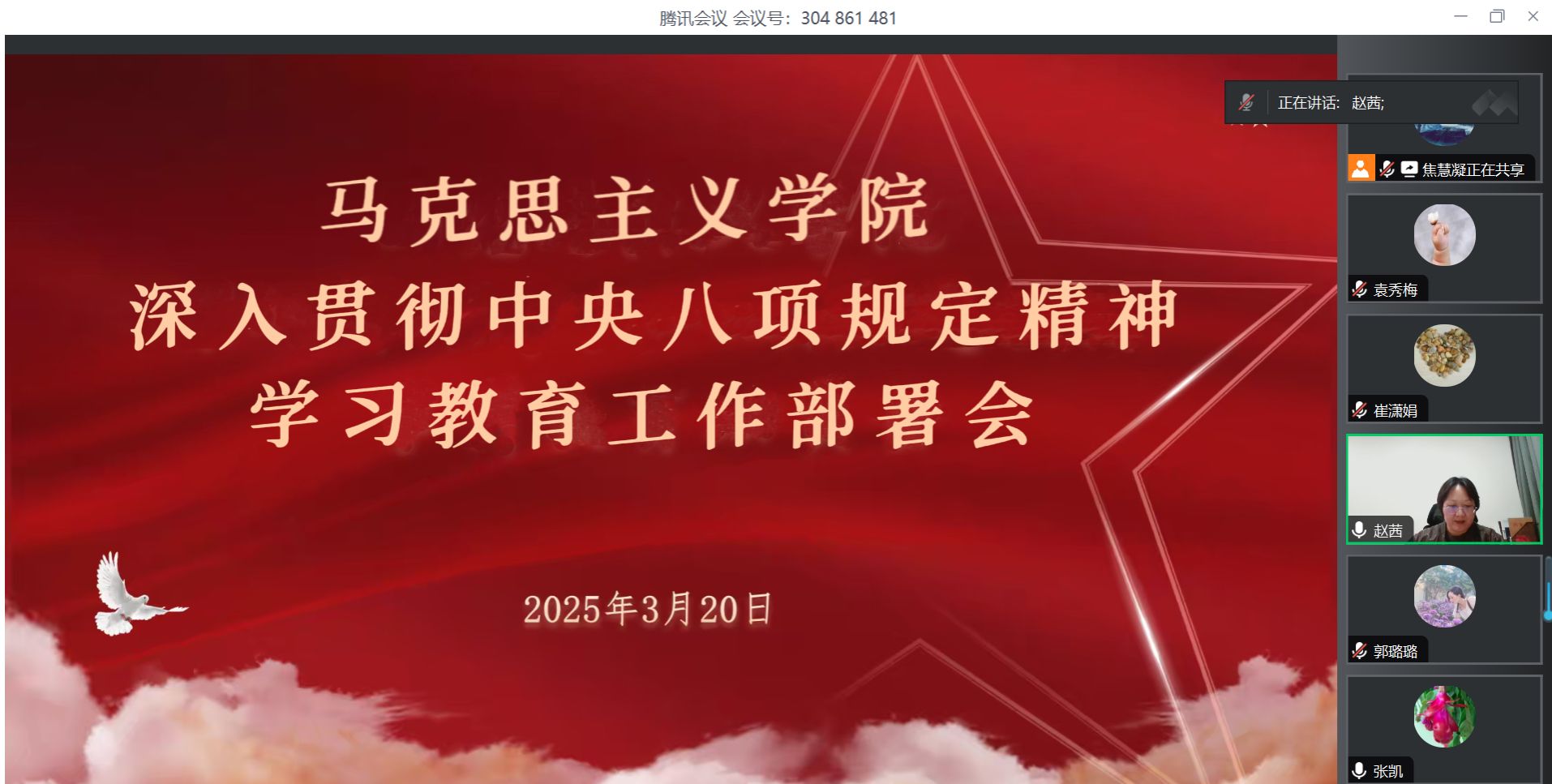 根据学校工作要求,3月20日,永利集团3044官网欢迎您党总支召开深入贯彻中央八项规定精神学习教育线上工作部署会。全体教工参加了会议。会议由院长张凯主持,党总支书记赵茜领学。